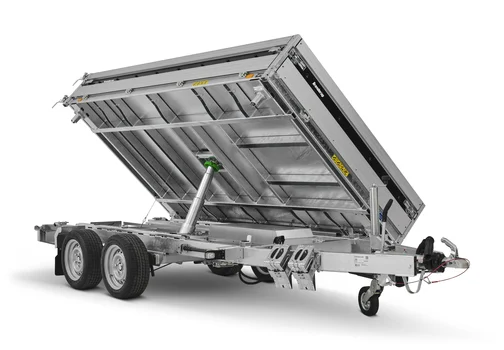 Pour l’entrepreneur c’est un outil idéal pour le transport et le déchargement de terre, de sable ou de gravier. Benne basculante robuste avec un ou deux essieux. Plancher renforcé en acier avec bennage hydraulique manuel ou électrique pour plus de facilité. Grâce à son angle d’inclinaison élevé, la remorque est adaptée au chargement, au transport et au déchargement de gravier, de bois et de matériaux de construction. Ridelles ouvrantes et amovibles, poteaux d’angle (ranchers) détachables. Anneaux d’arrimage intégrés au plancher. Vous pouvez équiper la remorque avec des rehausses de ridelles ou une bâche haute ou avec l’un des nombreux accessoires communs aux remorques de la série 4000. Les images sont fournies à titre indicatif uniquement et peuvent illustrer des équipements en option.